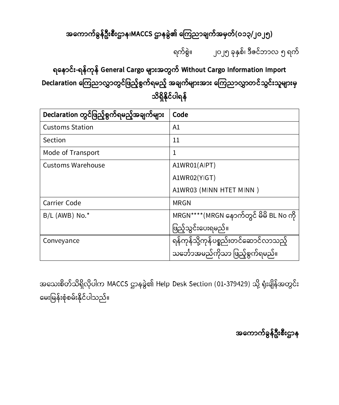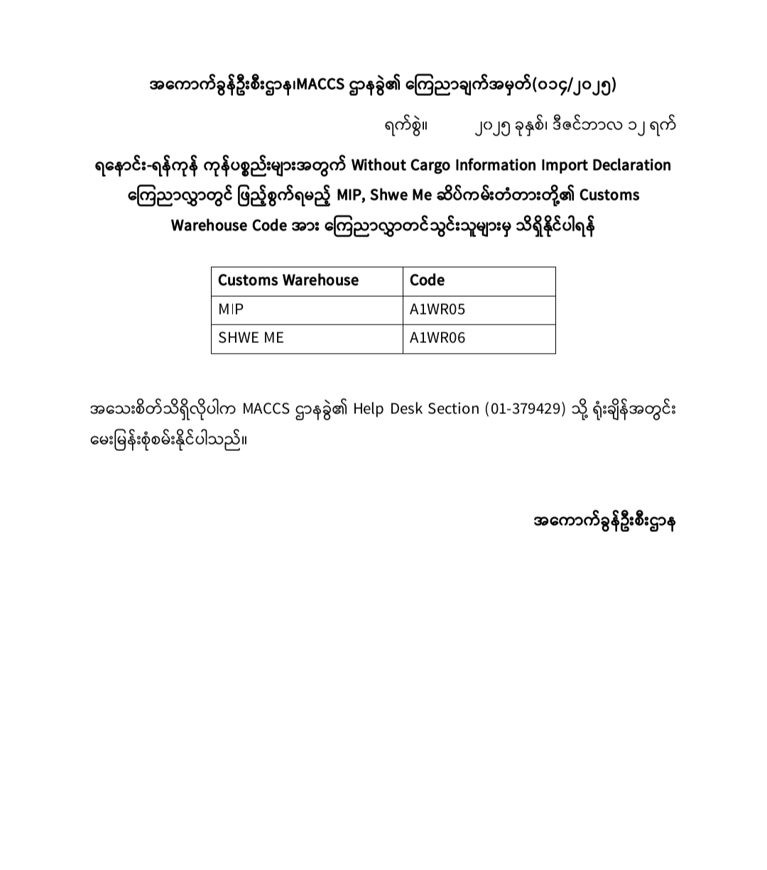 ရနောင်-ရန်ကုန် ကုန်ပစ္စည်းများအတွက် Without Cargo Information Import Declaration ကြေညာလွှာတွင် ဖြည့်စွက်ရမည့် MIP, Shwe Me ဆိပ်ကမ်းတံတားတို့၏ Customs Warehouse Code အား ကြေညာလွှာတင်သွင်းသူများမှ သိရှိနိုင်ရန်