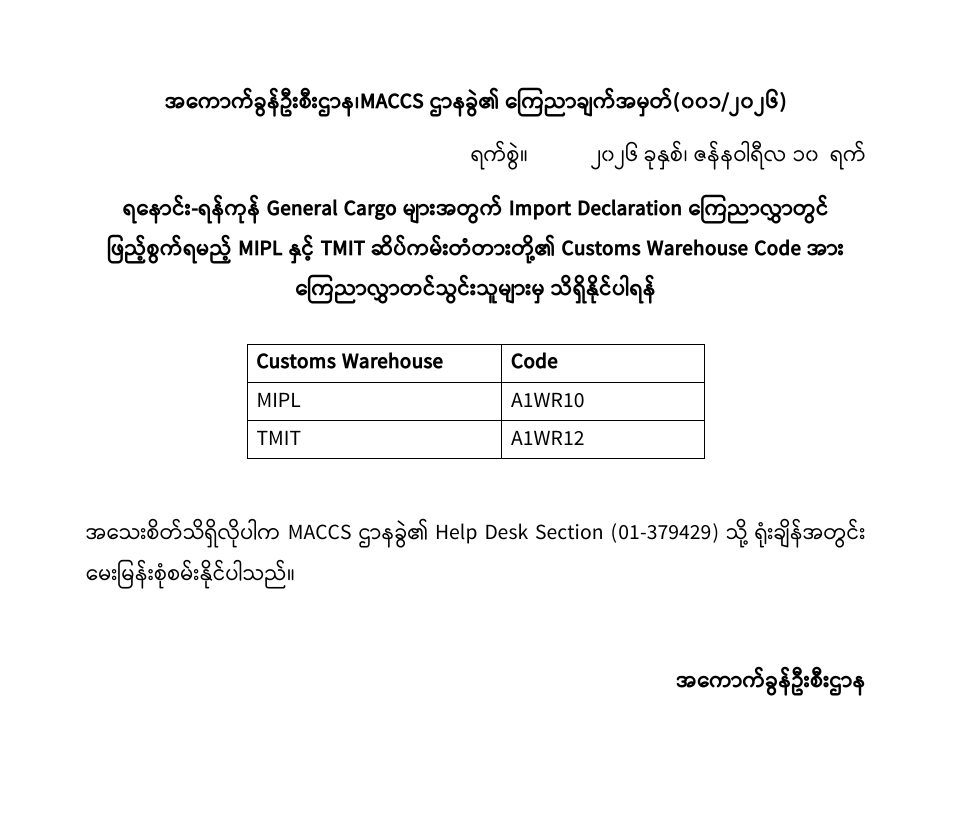 အကောက်ခွန်ဦးစီးဌာန၊ MACCS ဌာနခွဲ၏ ကြေညာချက်အမှတ် (၀၀၁/၂၀၂၆)