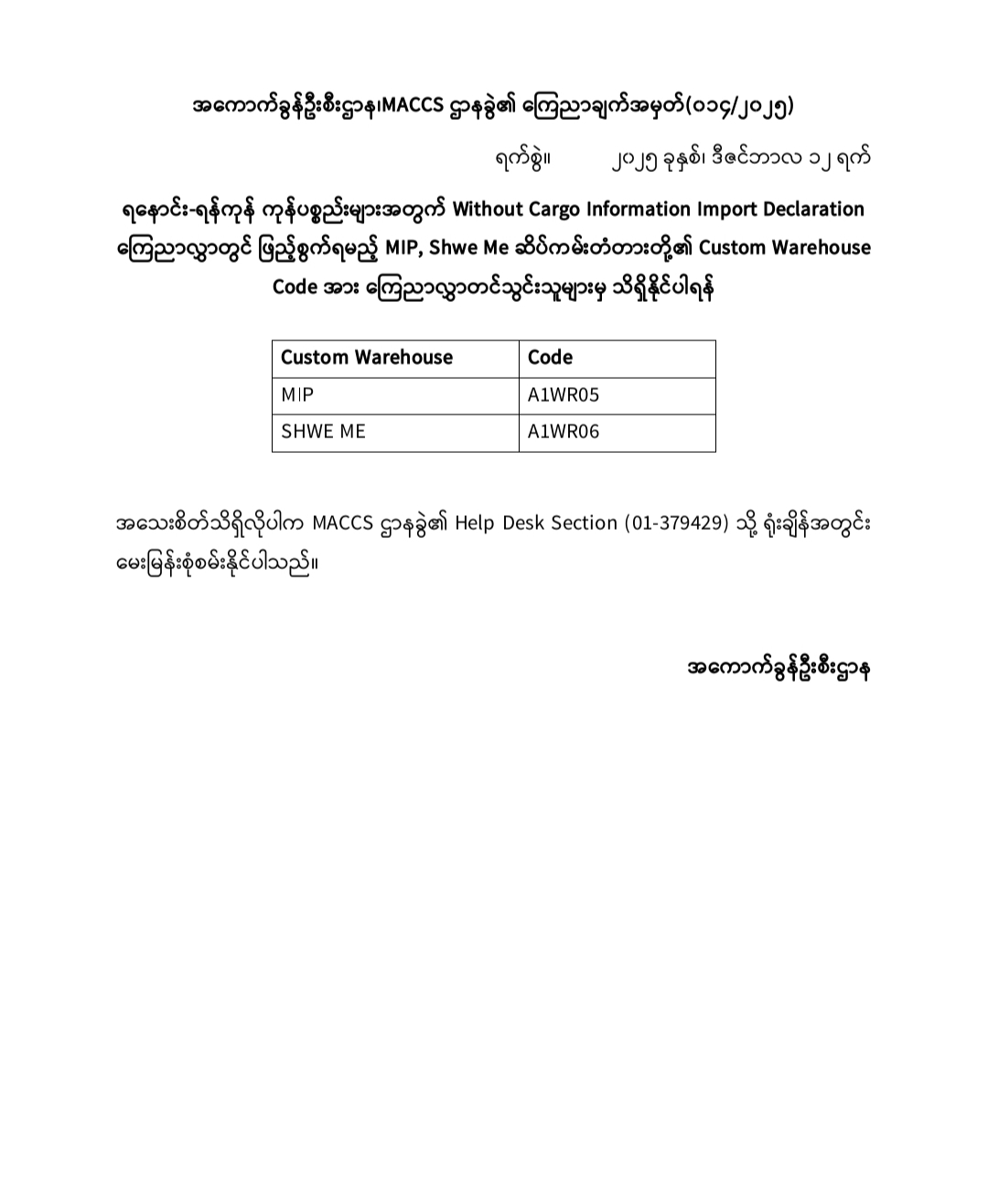 ရနောင်-ရန်ကုန် ကုန်ပစ္စည်းများအတွက် Without Cargo Information Import Declaration ကြေညာလွှာတွင် ဖြည့်စွက်ရမည့် MIP, Shwe Me ဆိပ်ကမ်းတံတားတို့၏ Customs Warehouse Code အား ကြေညာလွှာတင်သွင်းသူများမှ သိရှိနိုင်ရန်