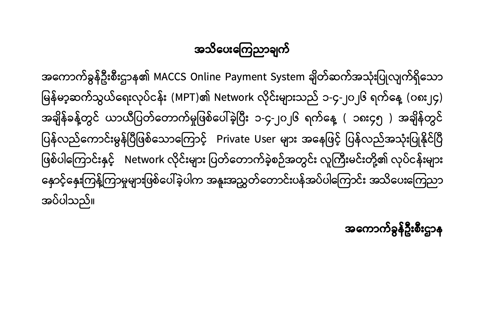 အကောက်ခွန်ဦးစီးဌာန၏ MACCS Online Payment System ချိတ်ဆက်အသုံးပြုလျက်ရှိ‌သော မြန်မာ့ဆက်သွယ်ရေးလုပ်ငန်း (MPT)၏ Network လိုင်းများသည် ၁-၄-၂၀၂၆ ရက်နေ့ (၀၈း၂၄) အချိန်ခန့်မှစတင်၍ ယာယီပြတ်တောက်မှု ဖြစ်ပေါ်ခဲ့သောကြောင့် ..................